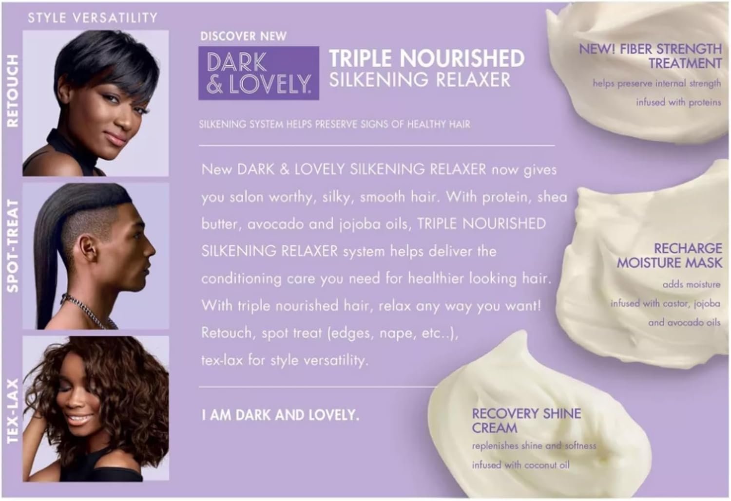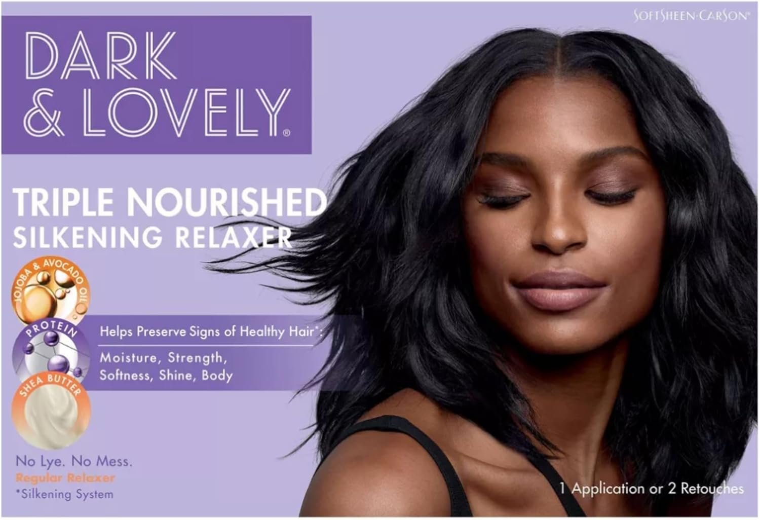 New and Improved Dark and Lovely No-Lye Relaxer with Moisture Seal plus Shea Butter technology plus Shea Butter for incredible moisture and shine to every strand; leaving hair straight, soft and healthy-looking.