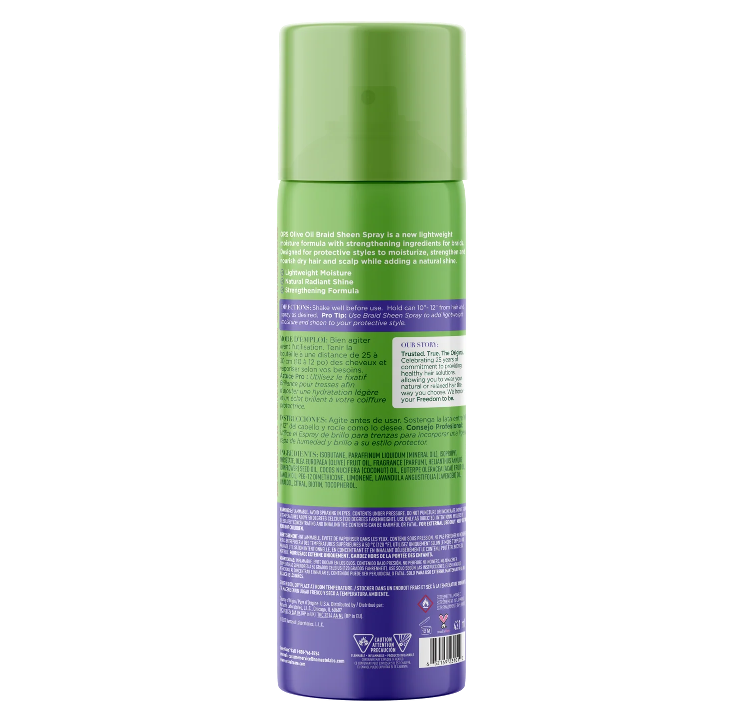ORS Olive Oil Braid Sheen Spray is a new lightweight, moisture-rich formula with strengthening ingredients. Designed for protective styles, this sheen spray moisturizes, strengthens and nourishes dry hair and scalp while adding a natural shine.