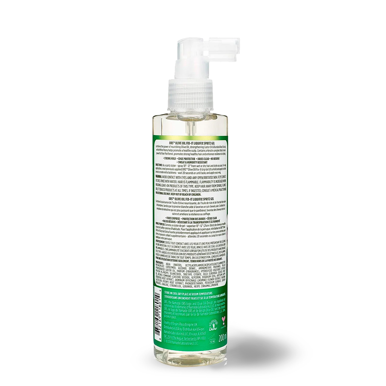 Directions: As a spritz styler – spray 10-12in from wet or dry hair and style as usual. For Wig application, reset previously applied ORS Olive Oil FIX-IT Grip Gel Ultra Hold and apply to desired areas to create extra tackiness-wait 20 seconds or until tack and apply your wig.