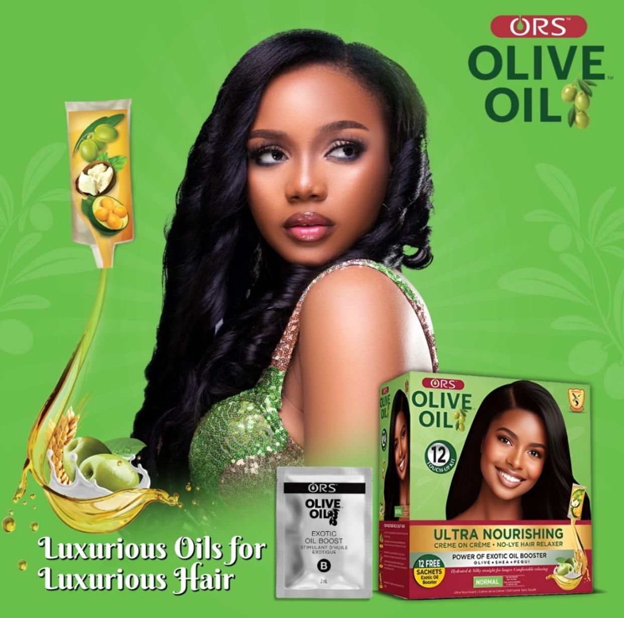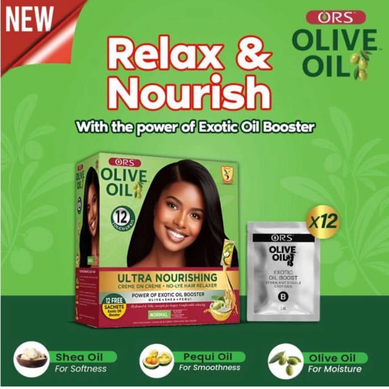 The new ORS Olive Oil Ultra Nourishing Creme on Creme No Lye Relaxer with Exotic Oils comes in a 12 creme base sachets , 12 activator cremes sachets and 12 exotic oils sachets. Now infused with shea oil, pequi oils and oilive oil. this new relaxer is formulated to give you lasting results while nourishing and strengthening your hair.