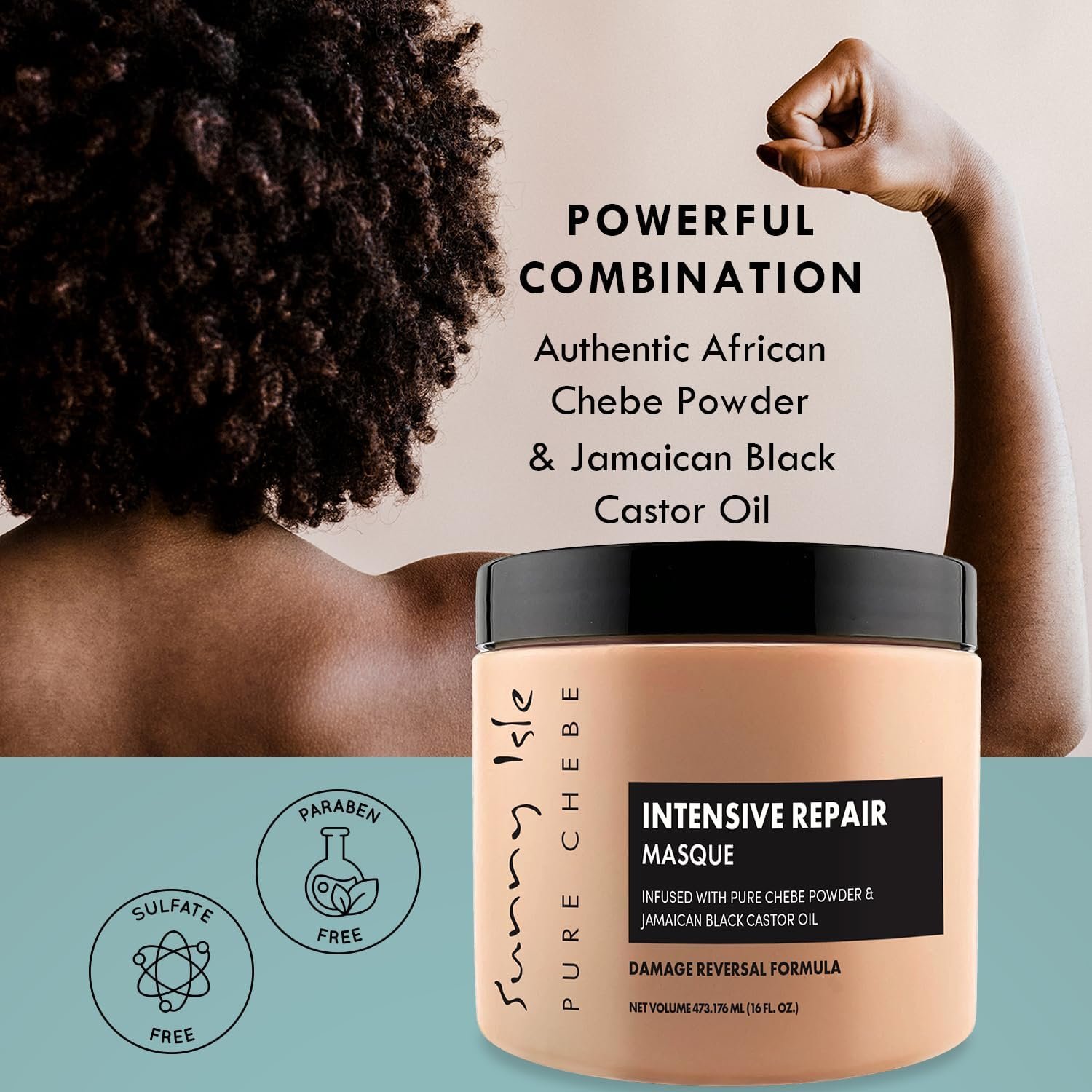 Sunny Isle Pure Chebe Intensive Repair Masque is infused with a combination of pure African Chebe powder and our pure Jamaican black castor oil.  These two potent strengthening ingredients are nature’s best remedies for healthy hair. Our deep conditioning masque nourishes your scalp, replenishes moisture, and softens hair texture by supporting elasticity and manageability. Highly effective all hair types including permed, natural, and curly hair.